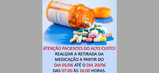 Atenção pacientes do alto custo, realizar a retirada dos medicamentos a partir do dia 05/06 até o dia 20/06, das 07:00 às 16:00, na Unidade Municipal de Saúde de Ribeirão dos Índios.