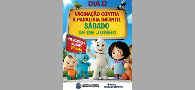 Até o dia 14 de junho está sendo realizada a campanha de vacinação contra a poliomielite, mas no próximo sábado, 08 de junho, haverá o DIA D DA POLIOMIELITE na Unidade Municipal de Saúde (Rua João Defende, nº 95). A vacina está disponível para todas as crianças menores de 05 anos. Comparecer com a carteira de vacinação e CPF ou cartão do SUS.
