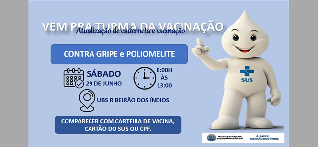 Neste sábado 29 de junho, haverá “ATUALIZAÇÃO DE CADERNETA E VACINAÇÃO”.