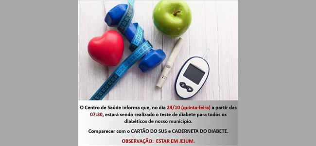 A partir das 07:30, na Unidade Municipal de Saúde, estará sendo realizado o teste de diabetes para todos os diabéticos do município. Interessados deverão comparecer com o CARTÃO DO SUS e CADERNETA DO DIABETES, além de ser necessário, estar em jejum.