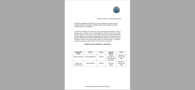 Nome/Razão Social: (Resolv Produções) - CPF/CNPJ 33.455.436/0001-24 - Edital 03/2023 - Nome do Projeto: CINEMA ITINERANTE NAS RUAS DE RIBEIRÃO DOS ÍNDIOS / Status: ATENDEU OS REQUISITOS DO EDITAL.